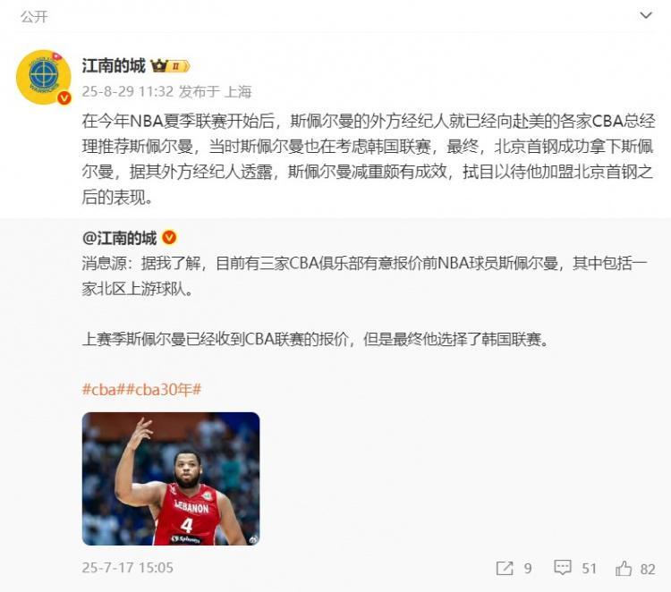@江南的城 在个人微博上写道:“在今年NBA夏季联赛开始后,斯佩尔曼的外方经纪人就已经向赴美的各家CBA总经理推荐斯佩尔曼,当时斯佩尔曼也在考虑韩国联赛,最终,北京首钢成功拿下斯佩尔曼,据其外方经纪人透露,斯佩尔曼减重颇有成效,拭目以待他加盟北京首钢之后的表现。”